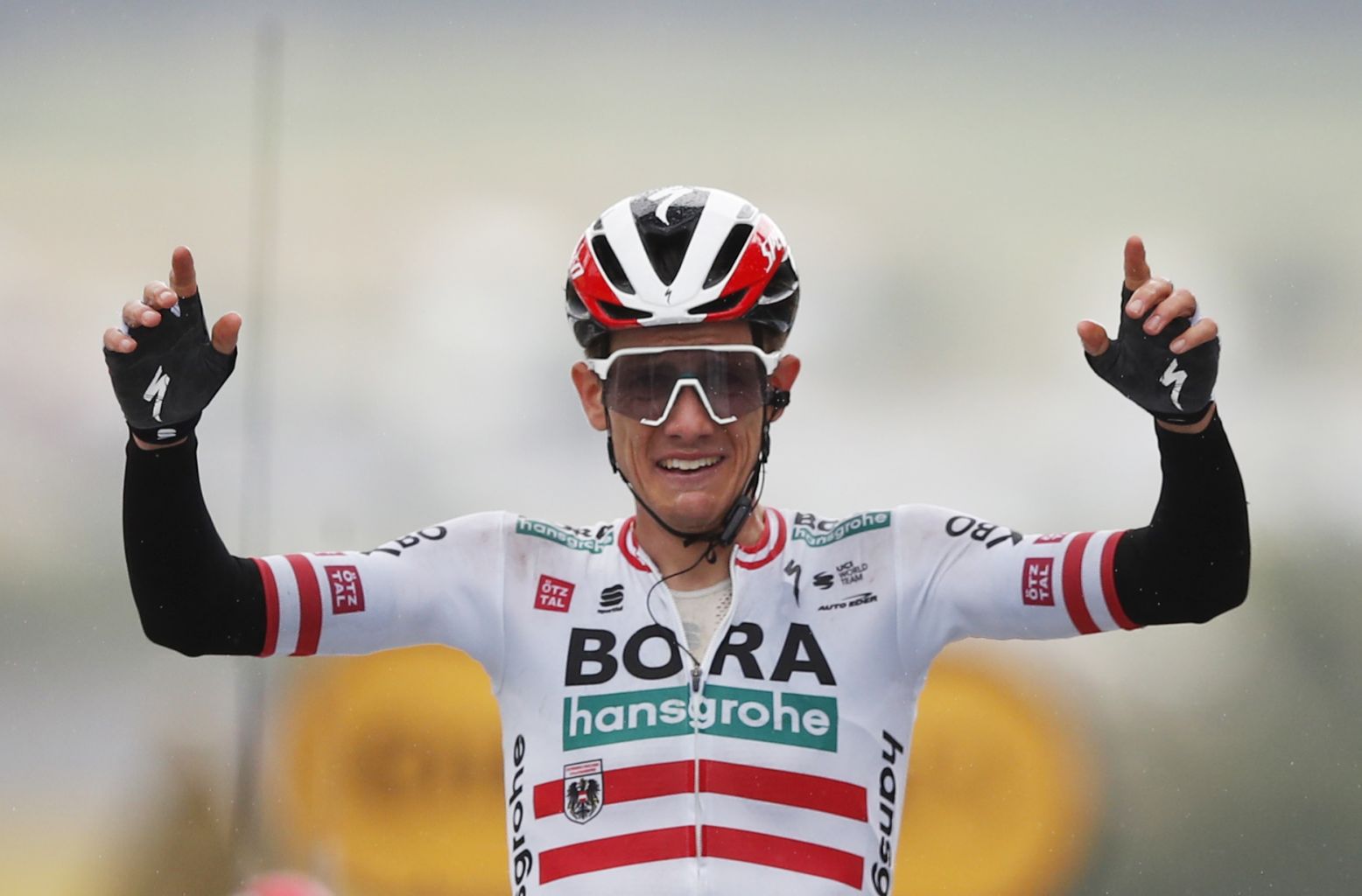 Bora–Hansgrohe rider Patrick Konrad of Austria celebrates as he crosses the finish line to win stage 16.