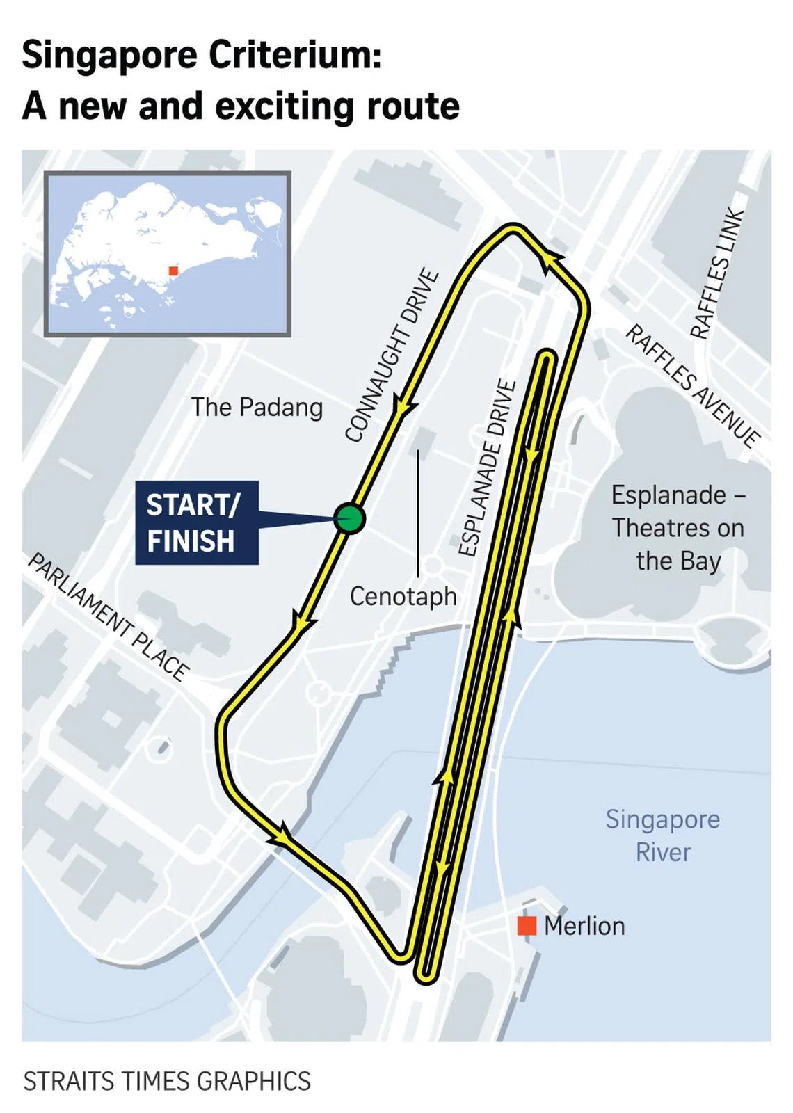 The Singapore Criterium from Nov 9 to 10 will feature a shorter 2.3km route – compared to the 3km route in 2023 – starting from Connaught Drive before looping around Esplanade Drive, going past landmarks such as the Cenotaph, Esplanade Park, Padang and Merlion.
