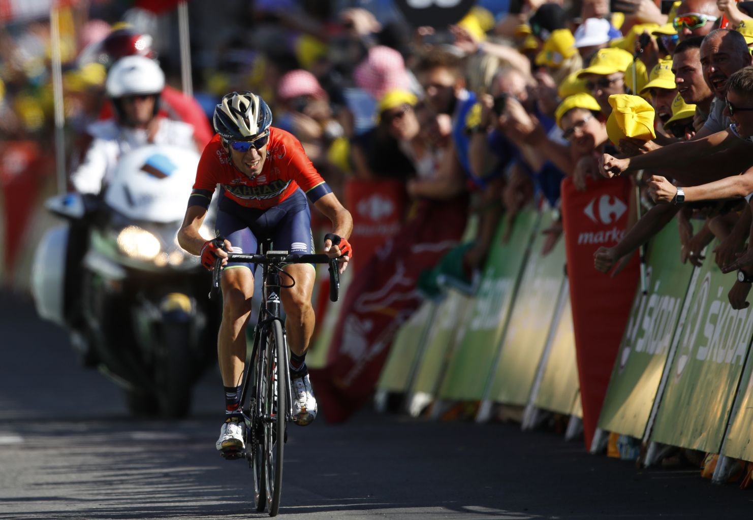L'ALPE D'HUEZ, France (AFP) - Former champion Vincenzo Nibali was doubtful for the remainder of the Tour de France after a collision, allegedly with a police motorbike, on Alpe d'Huez left him nursing a "suspected broken vertebra" in his back.