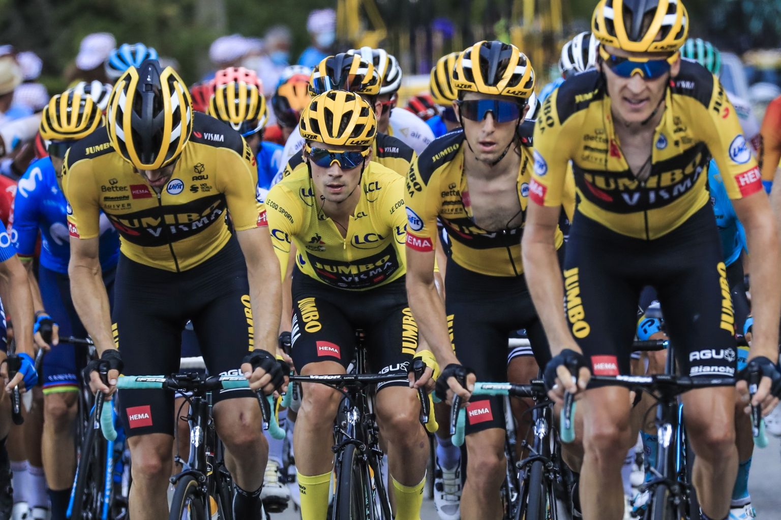 Roglic (centre), wearing the overall leader's yellow jersey leads the peloton with his Team Jumbo-Visma teammates during the 16th stage.