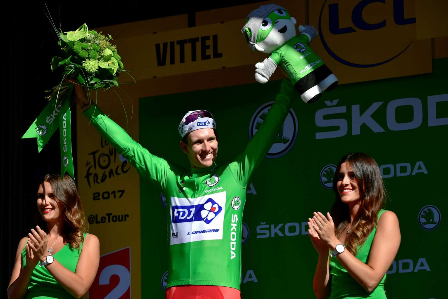 Demare celebrates his green jersey of best sprinter at the end of the 207,5 km fourth stage.