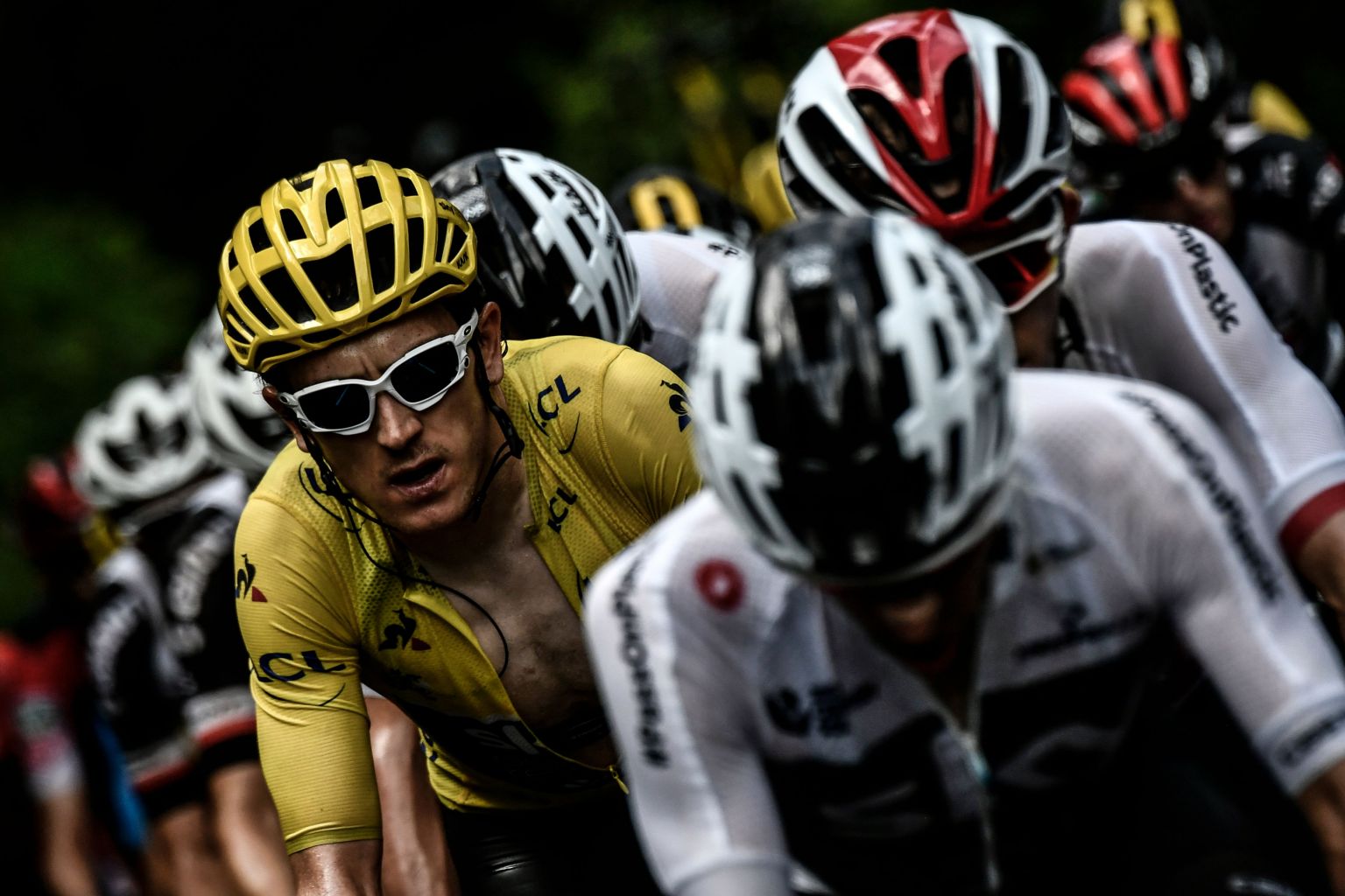 Thomas (left), wearing the overall leader's yellow jersey, rides in a counter attack group during the 19th stage.