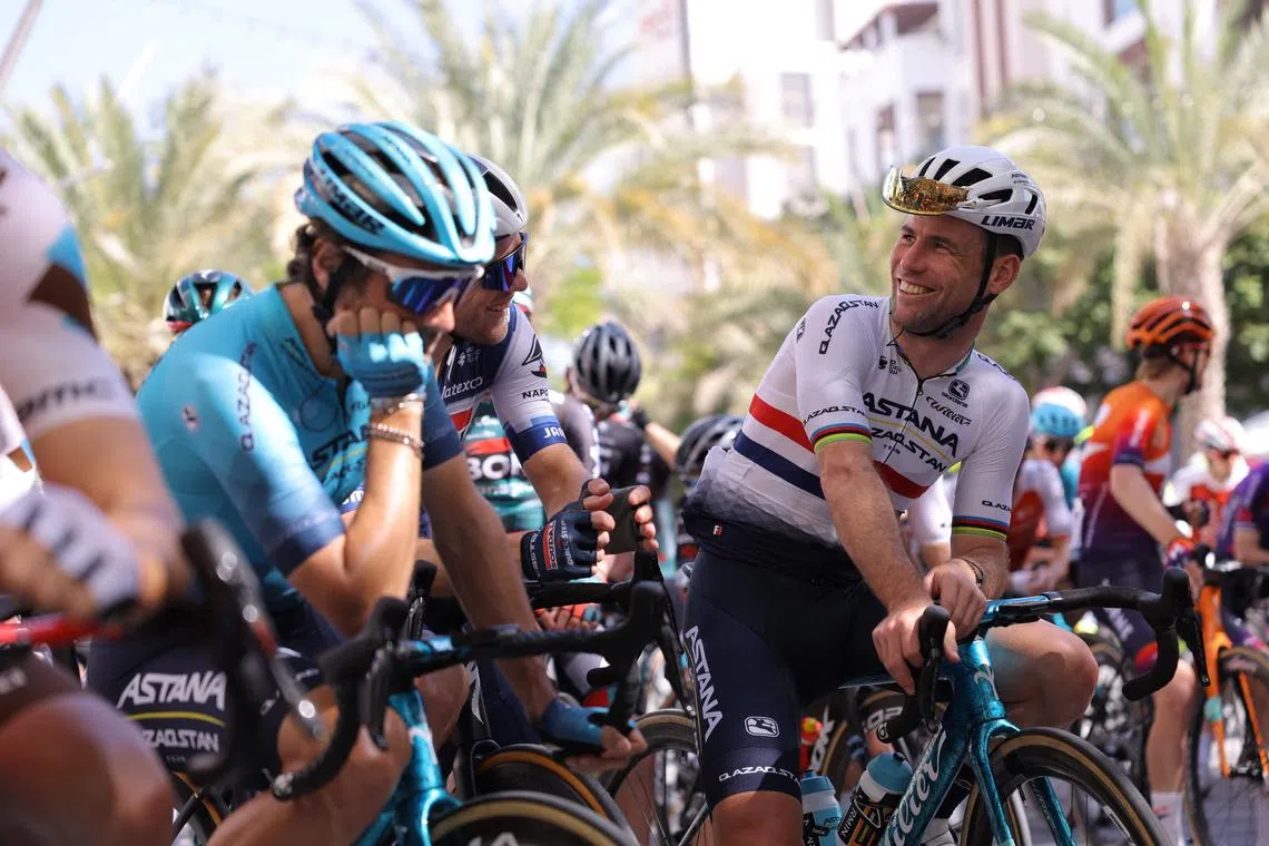 Mark Cavendish (right) speaks to other riders ahead of the Tour of Oman on Feb 10, 2023.