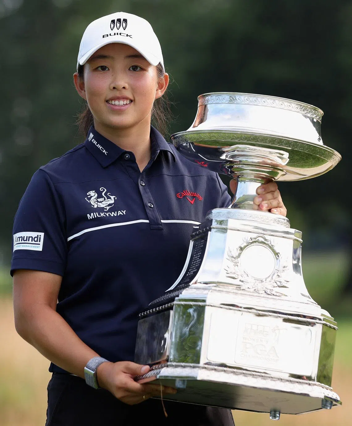 Yin Ruoning of China posing for a photo with the trophy after winning the Women's PGA Championship.