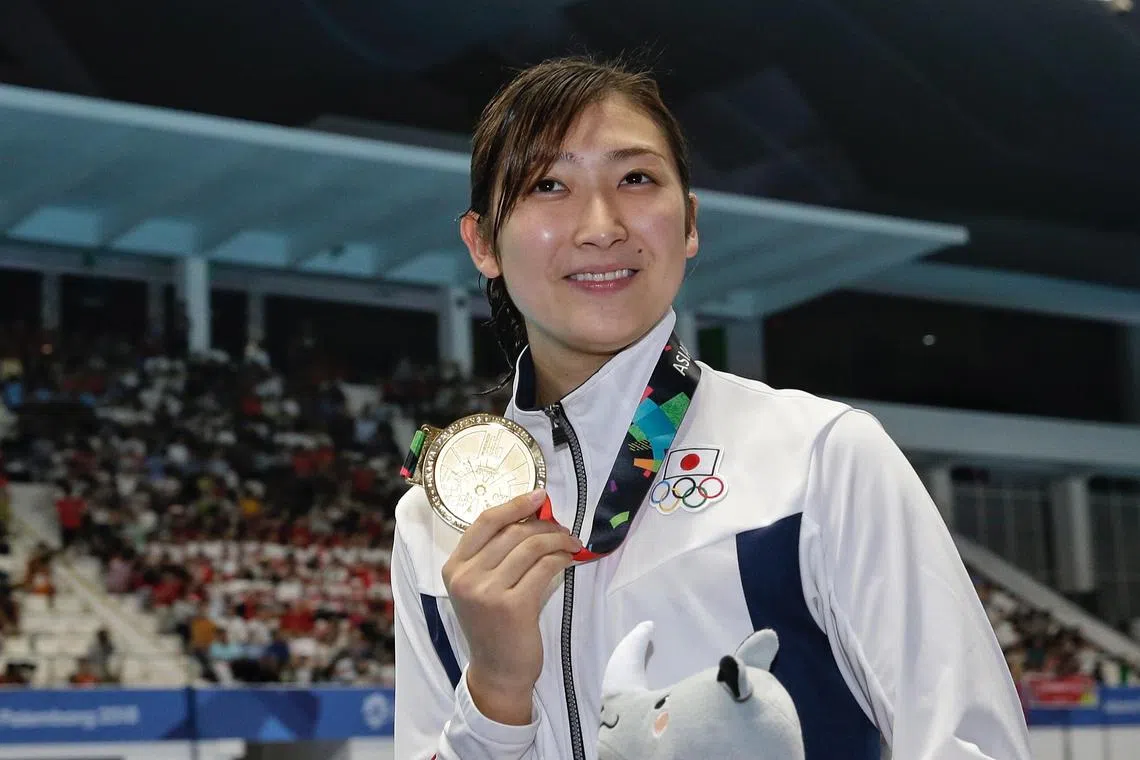 Rikako Ikee of Japan with her gold medal in the women’s 50m freestyle final at the 18th Asian Games in Gelora Bung Karno Aquatic Centre, Jakarta, Indonesia, on Aug 24, 2018.