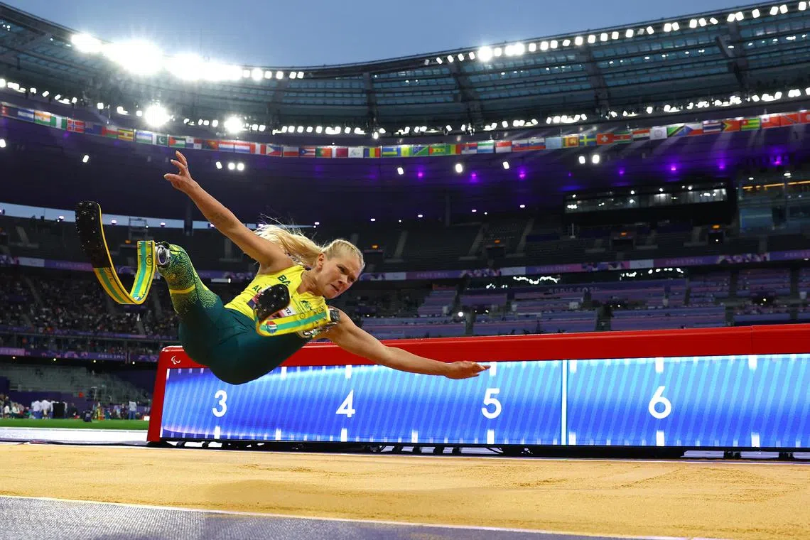 French President Emmanuel Macron was in the crowd at the Stade de France to watch the athletics action, as Australian double amputee Vanessa Low bettered her own world record to 5.45 metres in the women’s T63 long jump.