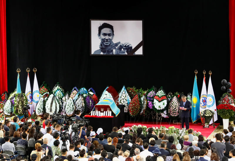 People attend the memorial service ahead of the funeral for Olympic figure skater Denis Ten in Almaty, Kazakhstan, on July 21, 2018.
