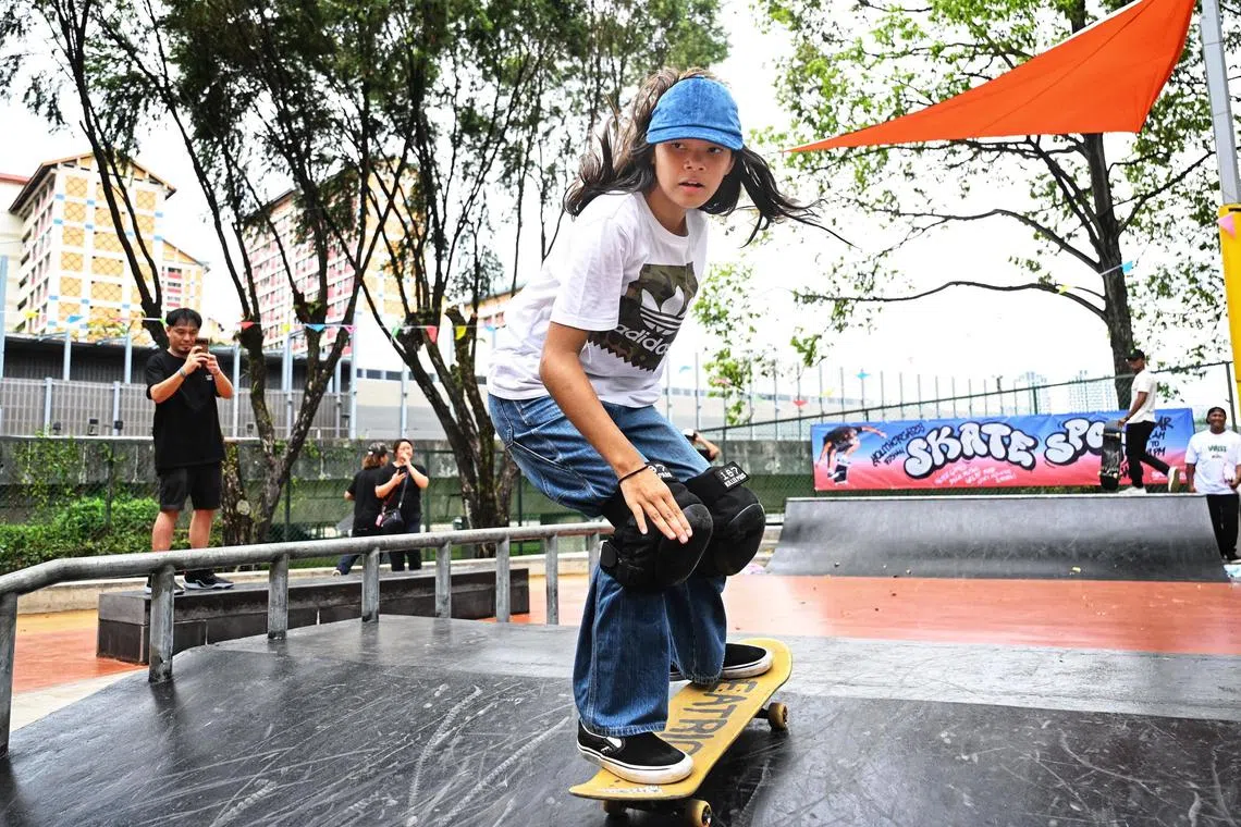 Eva Myra Zulkarnaen,13, skateboarding at the YouthCreates Bishan Skate Spot, located in Bishan Sport Centre, on March 16, 2025.