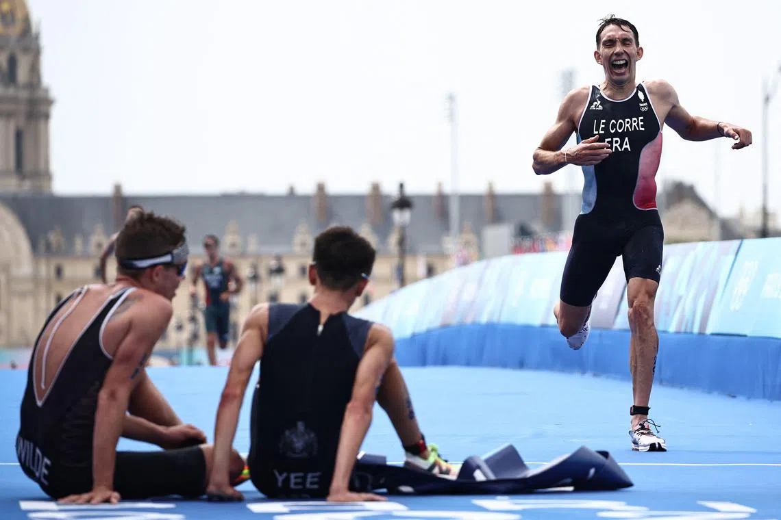 Hayden Wilde (left) of New Zealand sits next to Britain’s gold medallist Alex Yee as France’s Pierre Le Corre crosses the finish line to claim bronze in the men’s individual triathlon at the Paris 2024 Olympic Games.