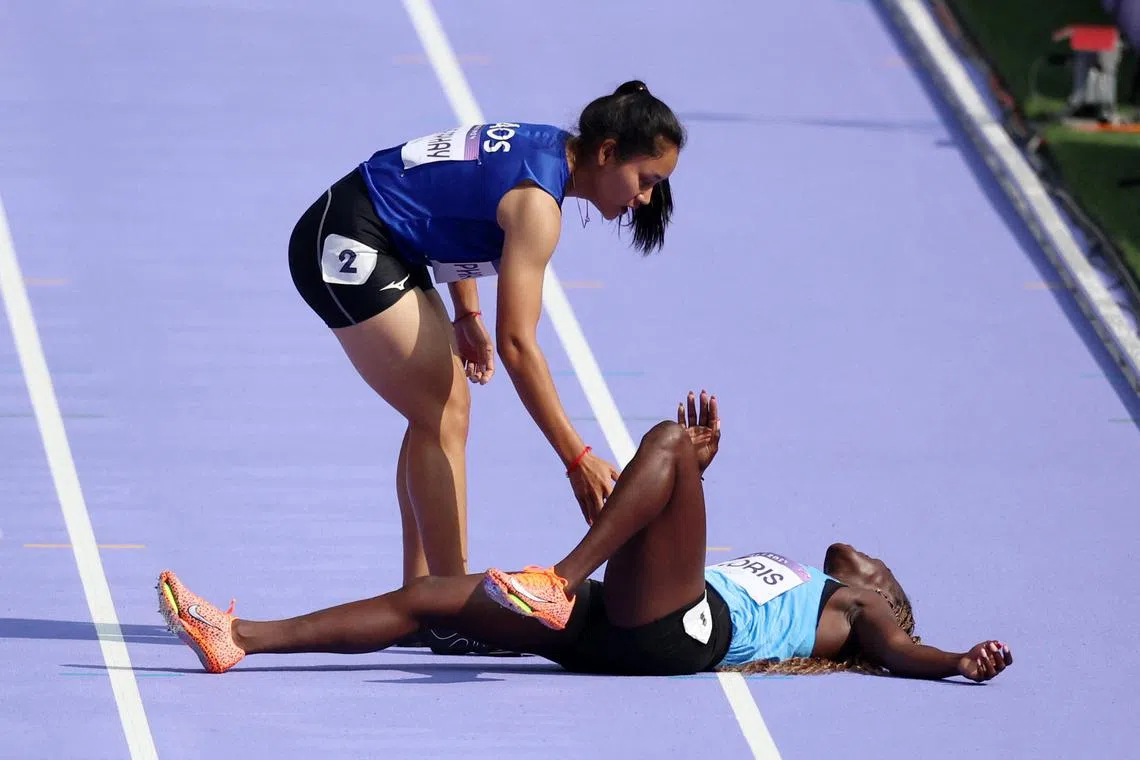 Silina Pha Aphay of Laos (left) was the first to help her rival, South Sudan’s Lucia Moris, after she collapsed on the ground clutching at her right leg during the preliminary sprinting heat of the women’s 100m race at the Stade de France.