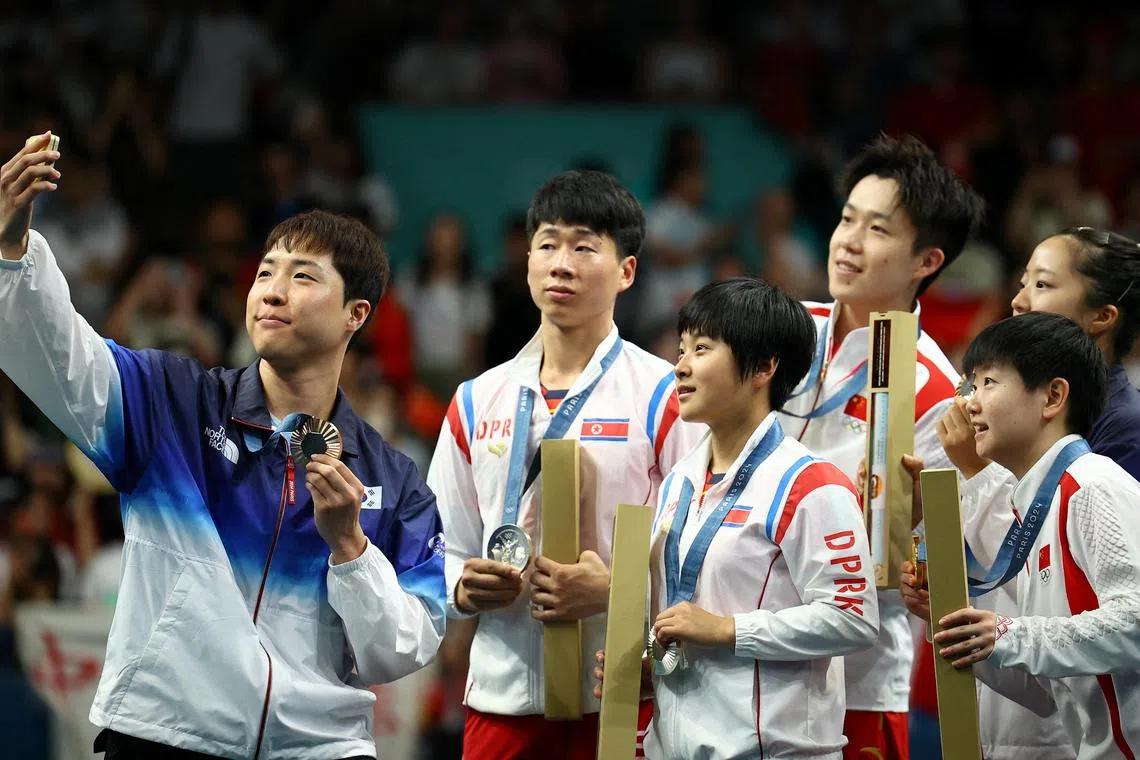 South Korea’s bronze medallists Lim Jong-hoon (left) and Shin Yu-bin takes a selfie with North Korea’s silver medallists Ri Jong-sik and Kim Kum-yong along with China’s gold medallists Wang Chuqin and Sun Yingsha during the table tennis mixed doubles victory ceremony.