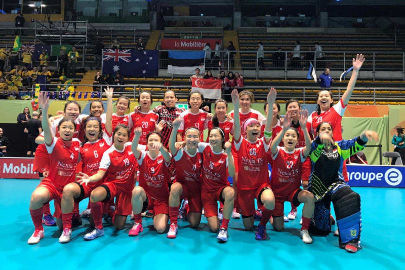 The Singapore women's floorball team at the World Floorball Championships in Neuchatel, Switzerland.