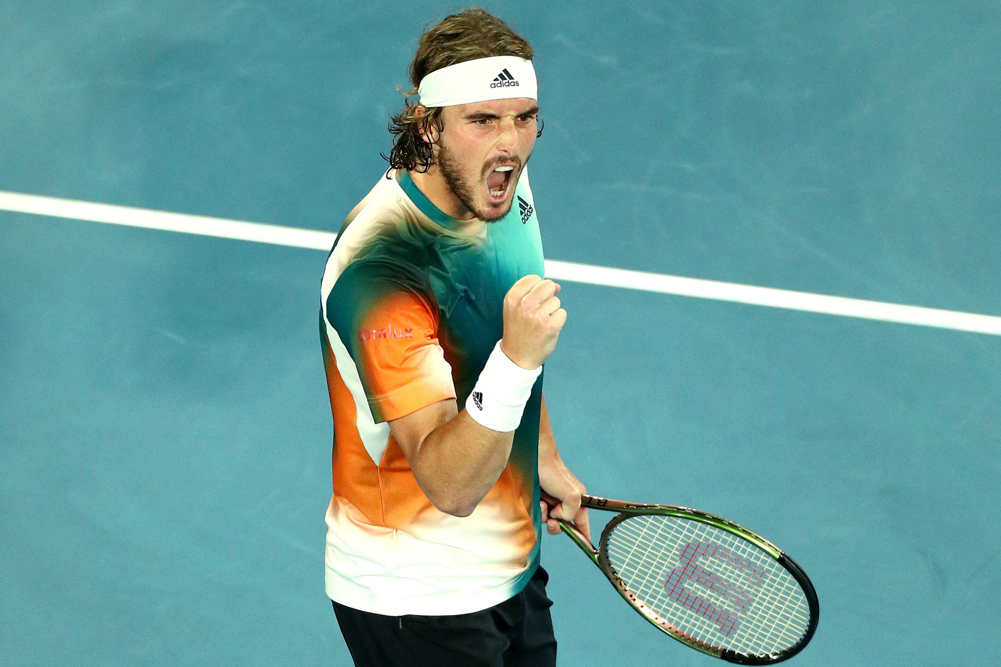 Stefanos Tsitsipas reacts after scoring a point against Jannik Sinner at the Australian Open, on Jan 26, 2022.