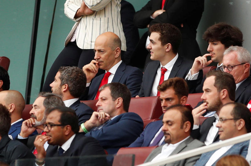 Arsenal chief executive Ivan Gazidis (top row, left) in the stands during the English Premier League match between Arsenal and Manchester City at the Emirates Stadium in London on Aug 12, 2018.