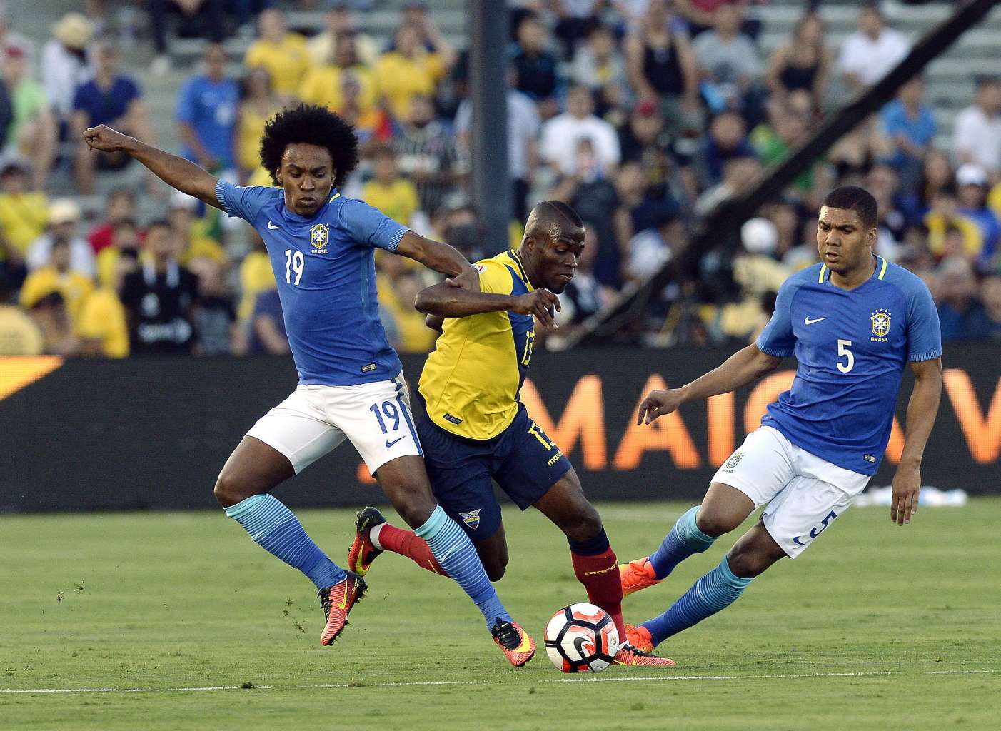 Willian (left) and Casemiro (right) of Brazil battle for the ball with Enner Valencia of Ecuador during the 2016 Copa America Centenario Group B match at the Rose Bowl on June 4, 2016.