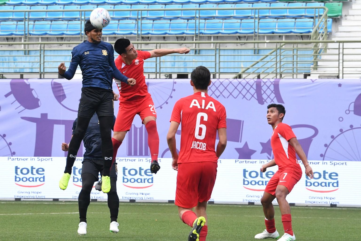 In this photo taken on March 31, national striker Fazrul Nawaz (in blue) engages in an aerial duel with Young Lions defender Lionel Tan during the match between Hougang United and the Young Lions.