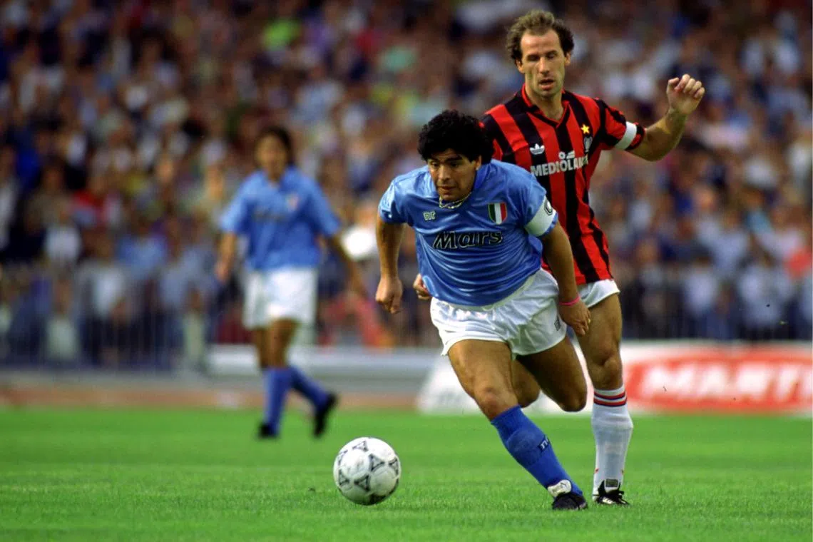 A 1990 photo showing AC Milan legend Franco Baresi (right) in action against Napoli’s Diego Maradona.