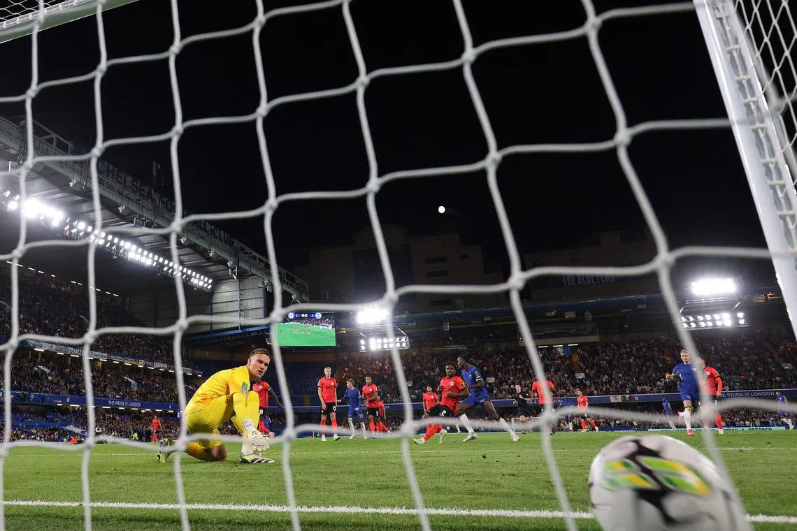 Chelsea’s Senegalese striker Nicolas Jackson scores the winning goal for Chelsea against Brighton.