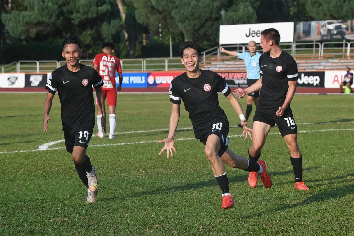 Khairin Nadim (left), Daniel Goh and Ryhan Stewart celebrate after Goh scores for Young Lions in their 3-2 Singapore Premier League win over Balestier Khalsa in 2021.