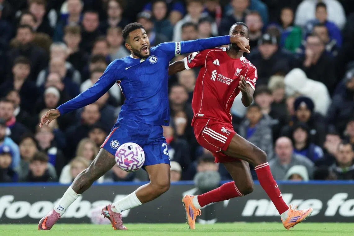 Chelsea's Reece James in action with Liverpool's Alexander Isak.