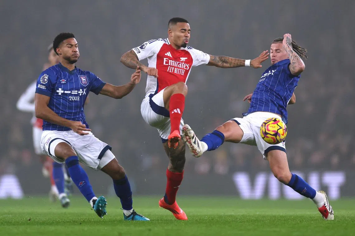 Arsenal’s Gabriel Jesus in action with Ipswich Town’s Kalvin Phillips.