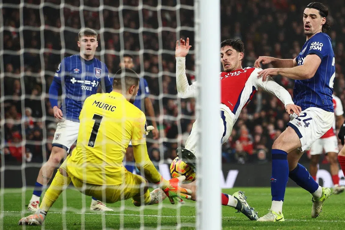 Ipswich goalkeeper Arijanet Muric (left) saves a ball in front of Arsenal’s Kai Havertz (centre), who is tackled by Ipswich’s Jacob Greaves (right).