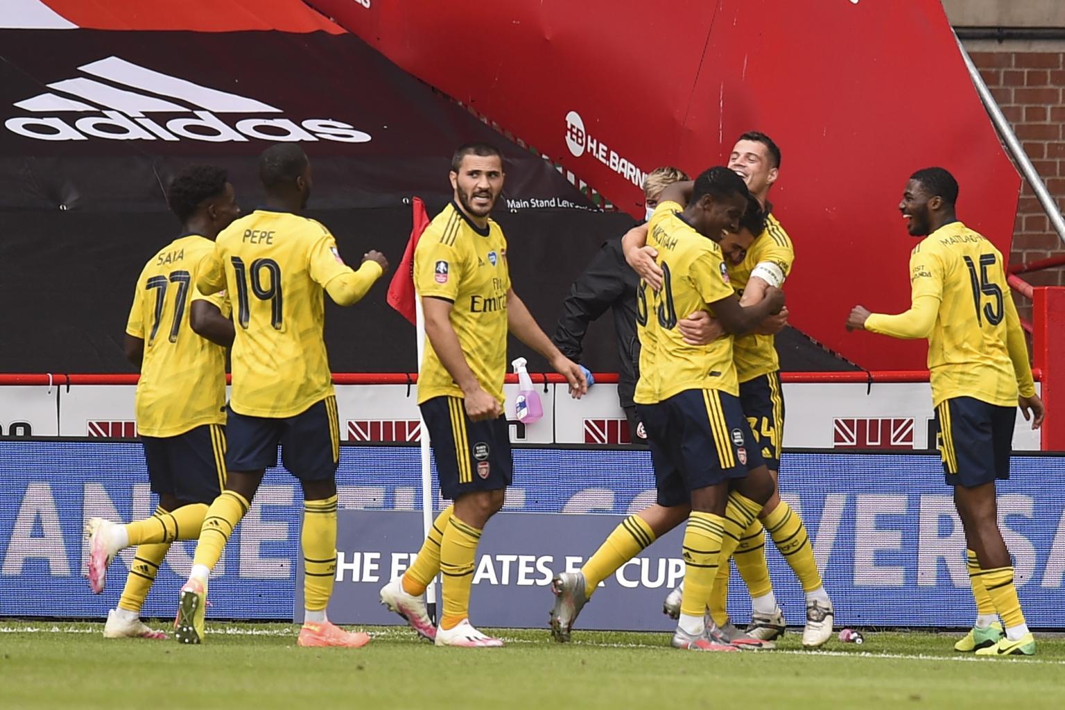 Arsenal players celebrate during the English FA Cup quarter final football match in Sheffield, Britain, on June 28, 2020.