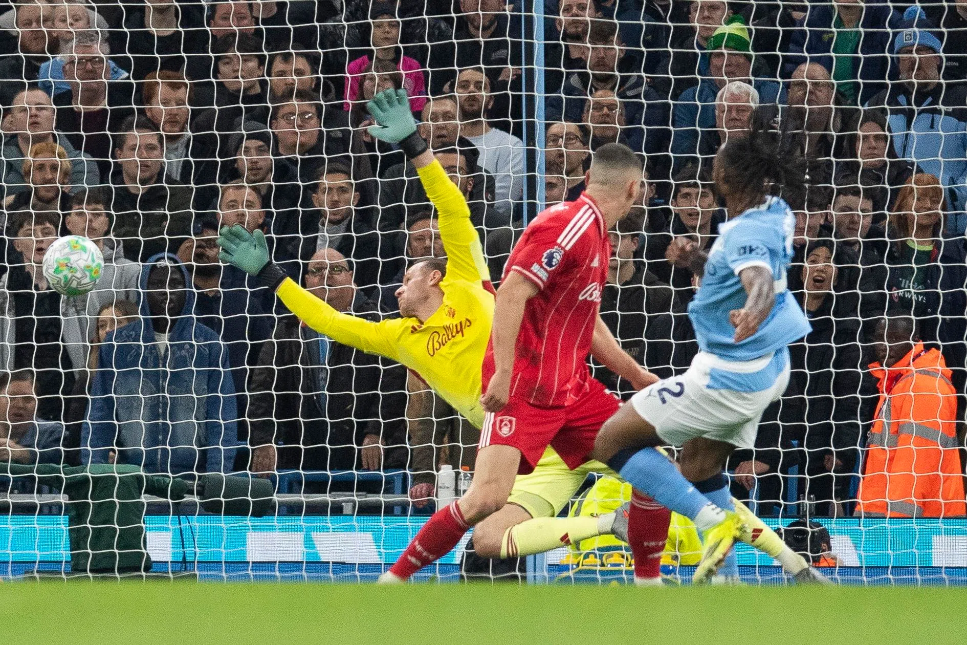 Antoine Semenyo of Manchester City (right) scores their first goal of the match against Nottingham Forest.