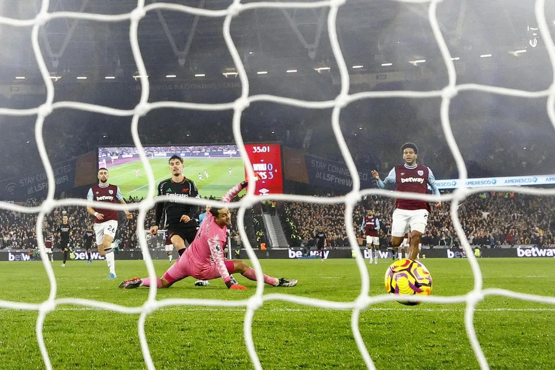 Gabriel Magalhaes, Leandro Trossard, skipper Martin Odegaard, Kai Havertz and Bukayo Saka were on target in a frenetic seven-goal first half at the London Stadium as Arsenal moved to 25 points. They are six points behind Liverpool, who hosted troubled champions Manchester City on Dec 1. The result of that game was not available at press time.