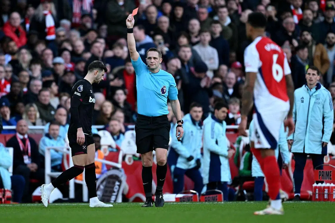 LONDON - Arsenal’s Premier League title challenge suffered a massive blow as the 10-man Gunners were beaten 1-0 at home by lowly West Ham on Feb 22.