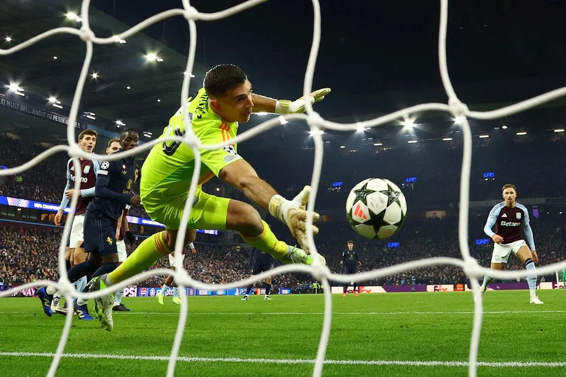 Aston Villa’s Argentinian goalkeeper Emiliano Martinez making a save.