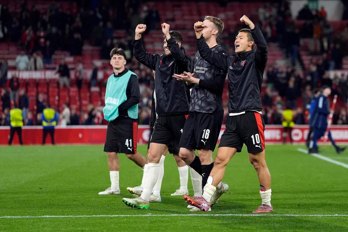 Midtjylland players celebrate their win over Nottingham Forest on Oct 2.