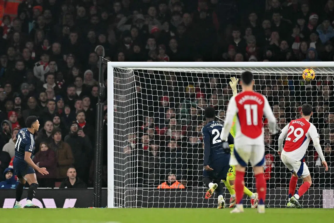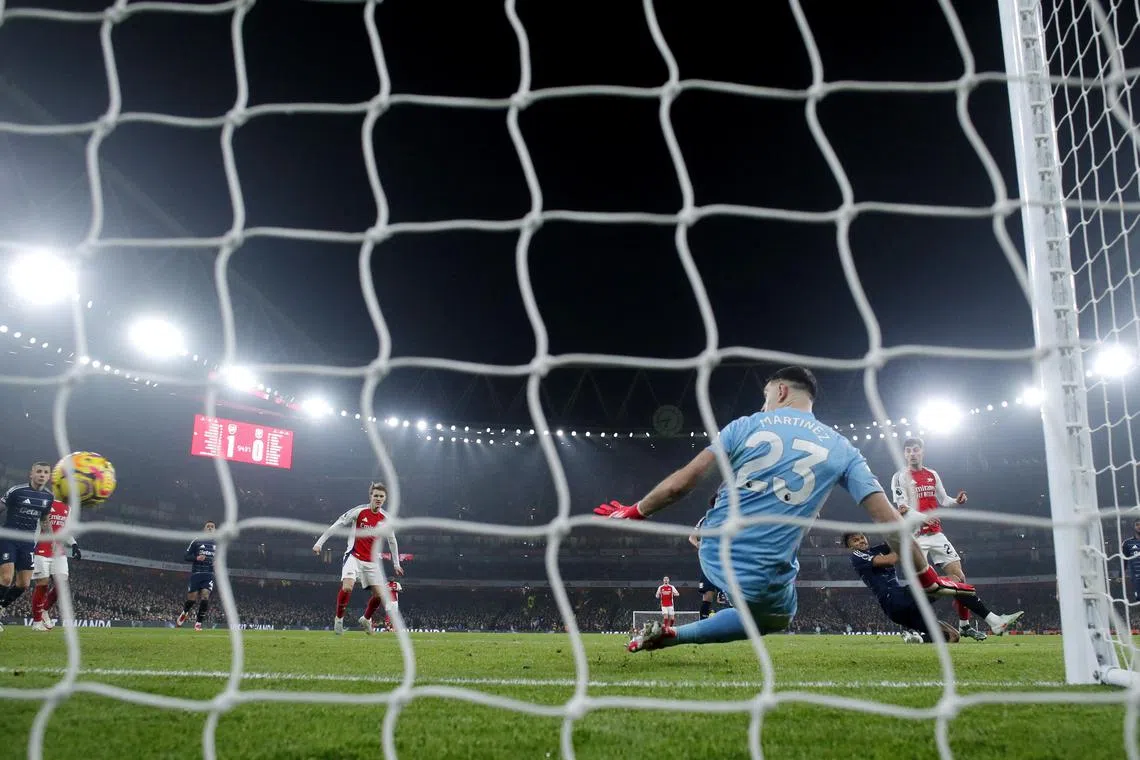 Arsenal’s Kai Havertz scores their second goal past Aston Villa’s Emiliano Martinez.