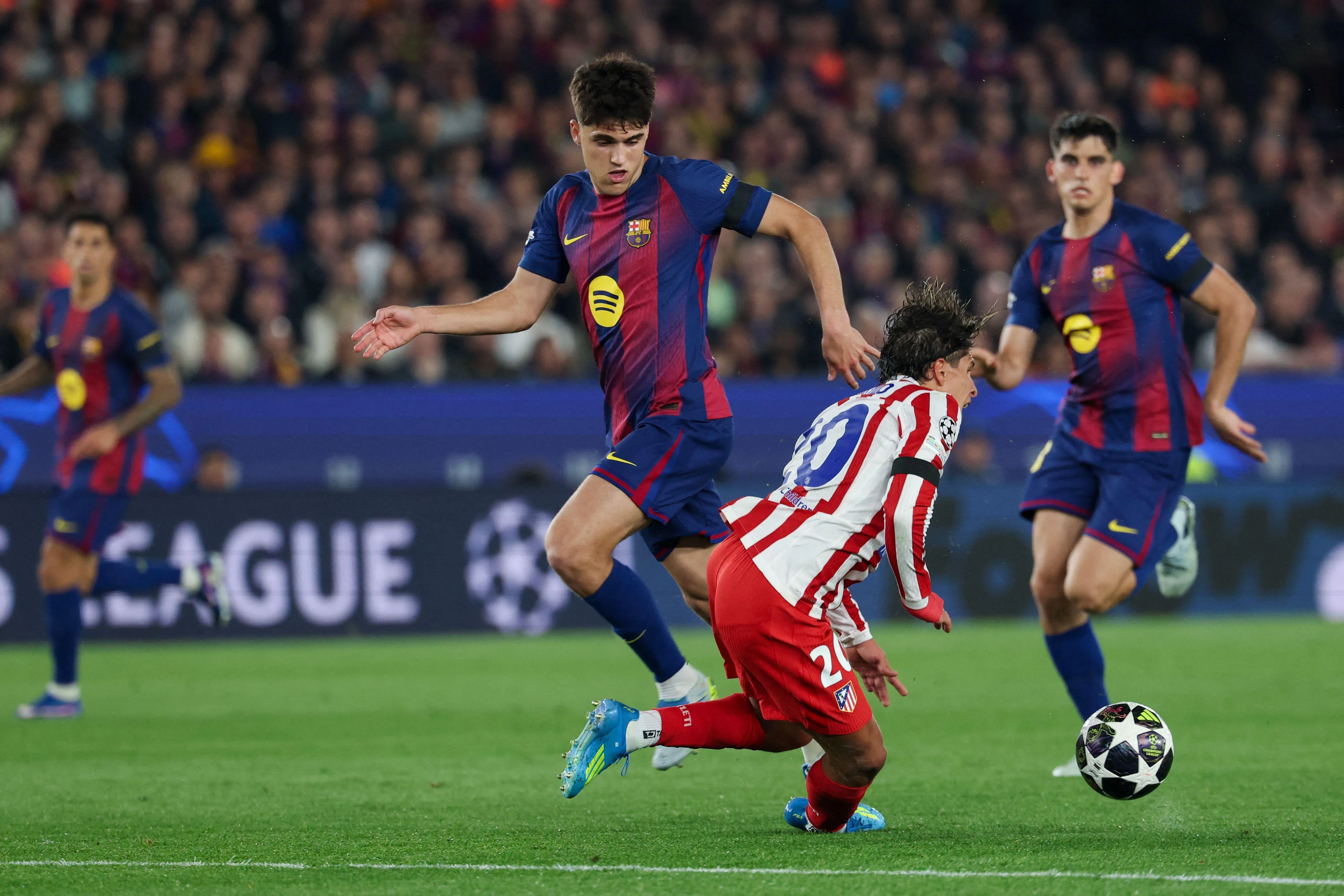 Barcelona's Spanish defender Pau Cubarsi (left) collides with Atletico Madrid's Argentine forward Giuliano Simeone.