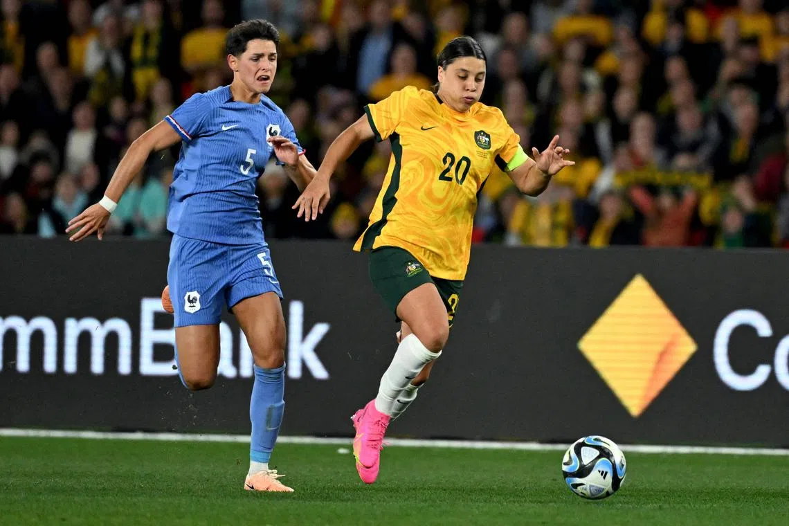 France’s Elisa De Almeida (left) and Australia’s Sam Kerr fighting for the ball during the international friendly match on Friday.