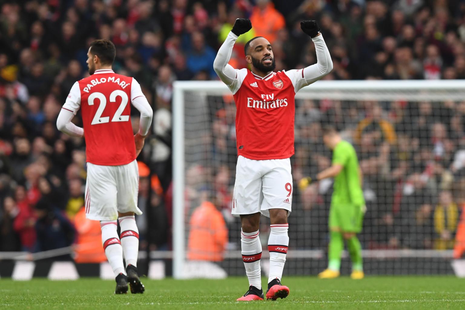 Arsenal's Alexandre Lacazette (right) after being awarded a goal during the English Premier League soccer match between Arsenal and West Ham United in London on March 7, 2020.
