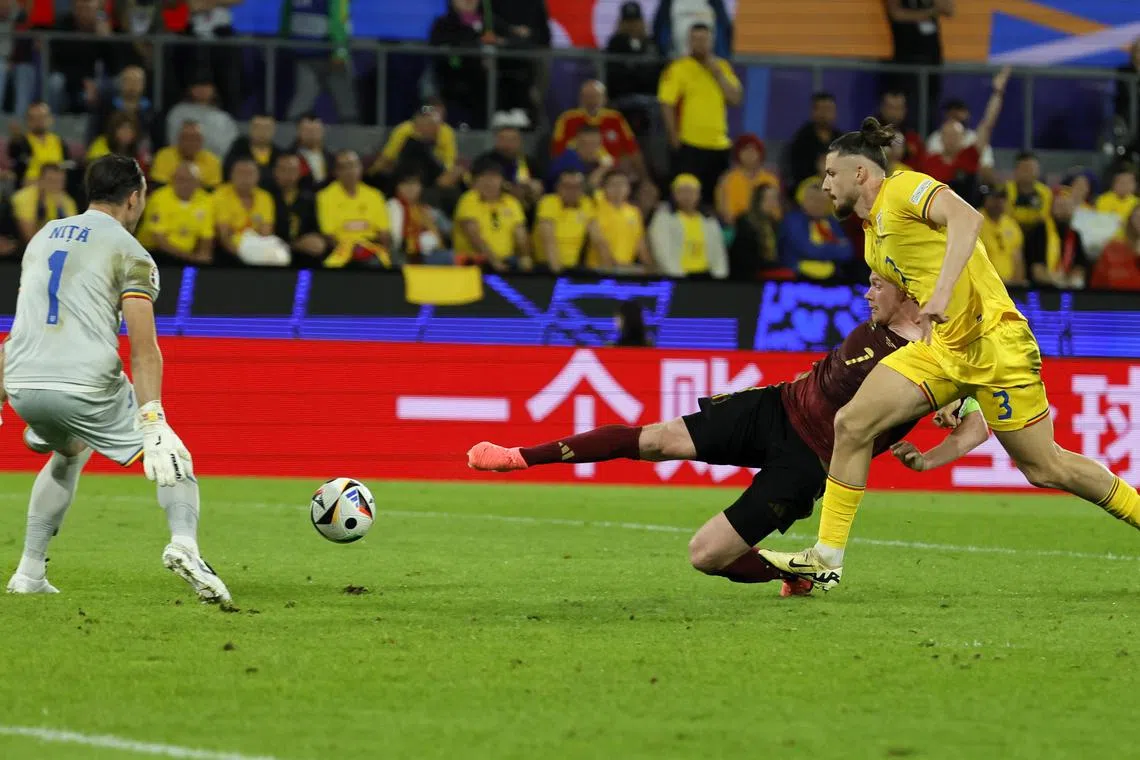 Four minutes later Romania went close with a header by Radu Dragusin that Koen Casteels saved well, but it was a brief respite as Belgium ran the first-half show.