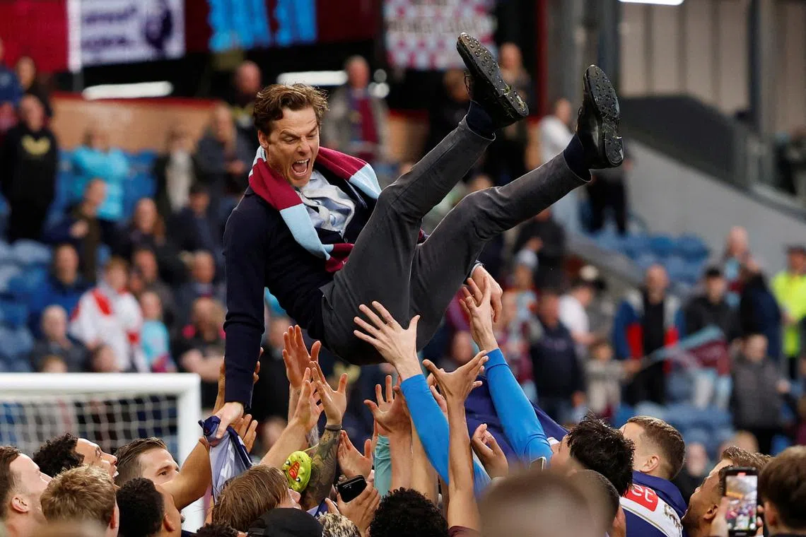 Burnley manager Scott Parker is thrown in the air by his players after Burnley are promoted to the Premier League.