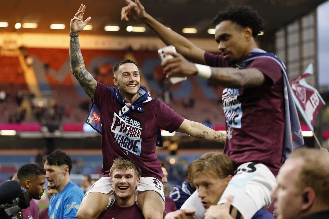 Burnley’s Josh Brownhill and teammates celebrate after being promoted to the Premier League.