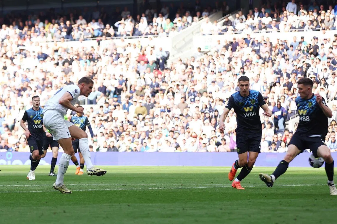 Tottenham Hotspur’s Micky van de Ven scores their second, winning goal.