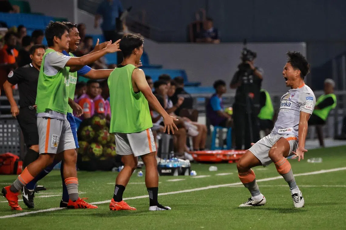 Albirex Niigata’s Keito Komatsu (right) celebrating with his teammates after scoring with a long range lobbed shot from just inside Hougang United’s half.