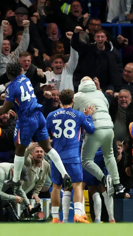 Chelsea's Estevao celebrates scoring their second goal with fans, manager Enzo Maresca (right) and teammates.