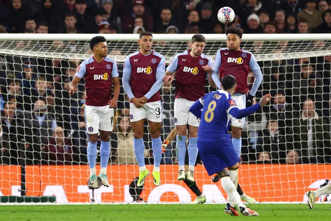 Chelsea’s Enzo Fernandez scoring their third goal from a free kick, in Birmingham, on Feb 7.