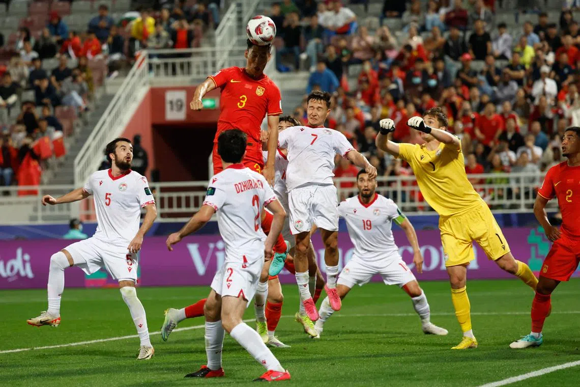 China’s defender Zhu Chenjie leaps for a header during the match against Tajikistan.