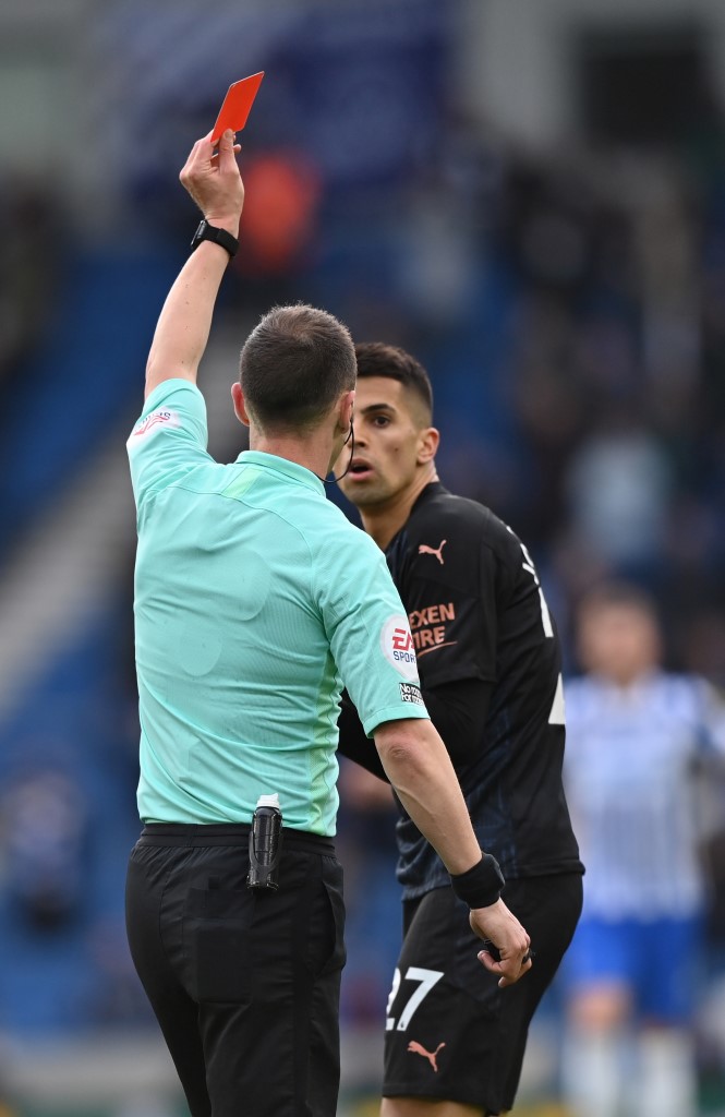 Brighton striker Danny Welbeck getting involved in a clash with Manchester City's Joao Cancelo, who receives a red card for his harsh tackle.