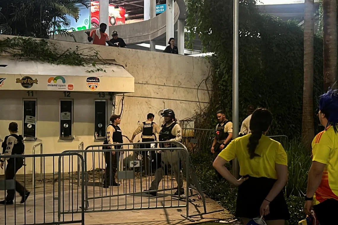 Police stand guard as fans are not being allowed to enter the Hard Rock Stadium for the Copa America Finals between Argentina and Colombia in Miami Gardens, Florida, on July 14.
