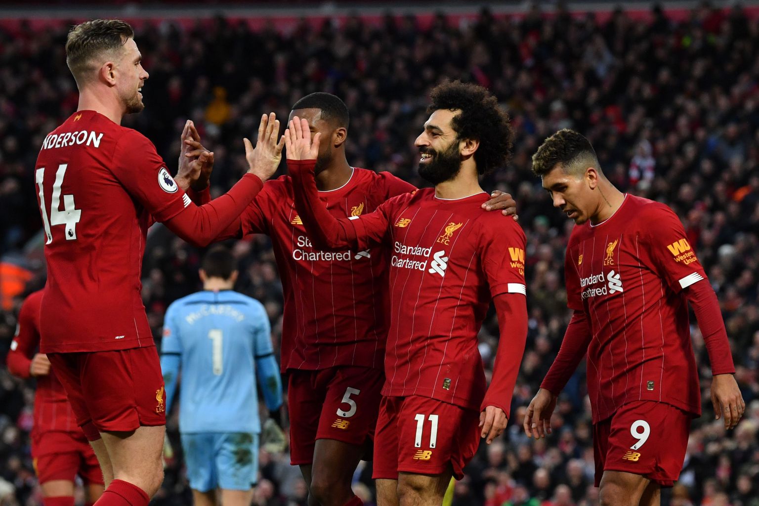 Mohamed Salah (centre) of league leaders Liverpool celebrates a goal with team mates.