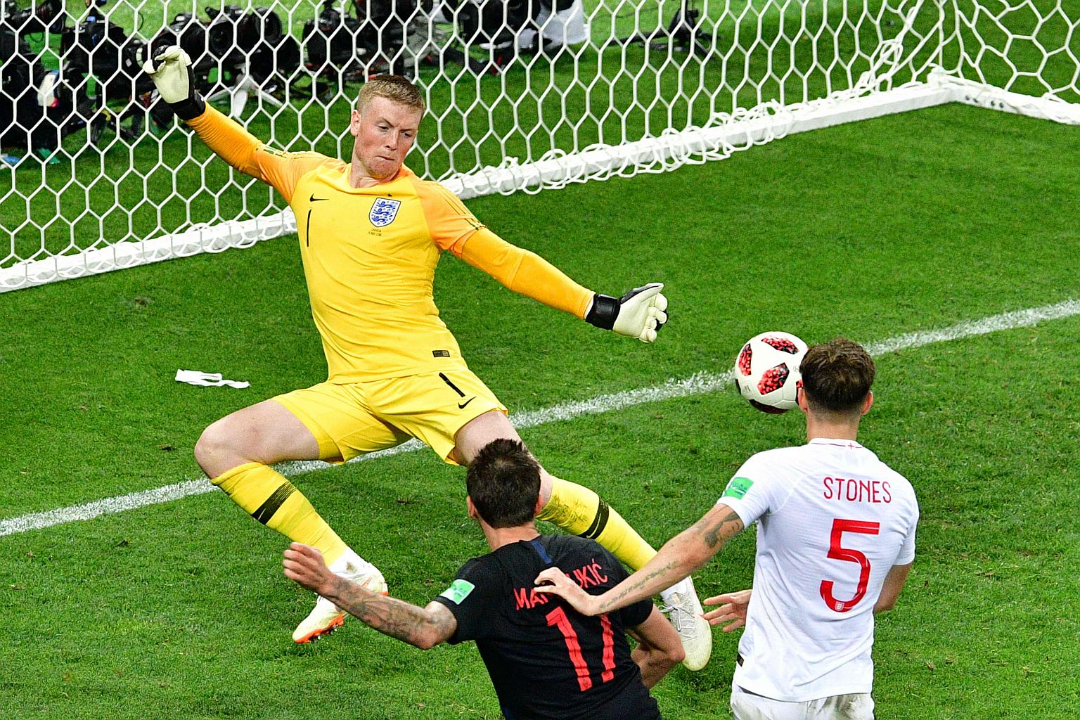 Croatia's forward Mario Mandzukic (centre) scores his team's second goal past England's goalkeeper Jordan Pickford (left) during the 2018 World Cup semi-final football match between Croatia and England at the Luzhniki Stadium in Moscow, on July 11, 2018.