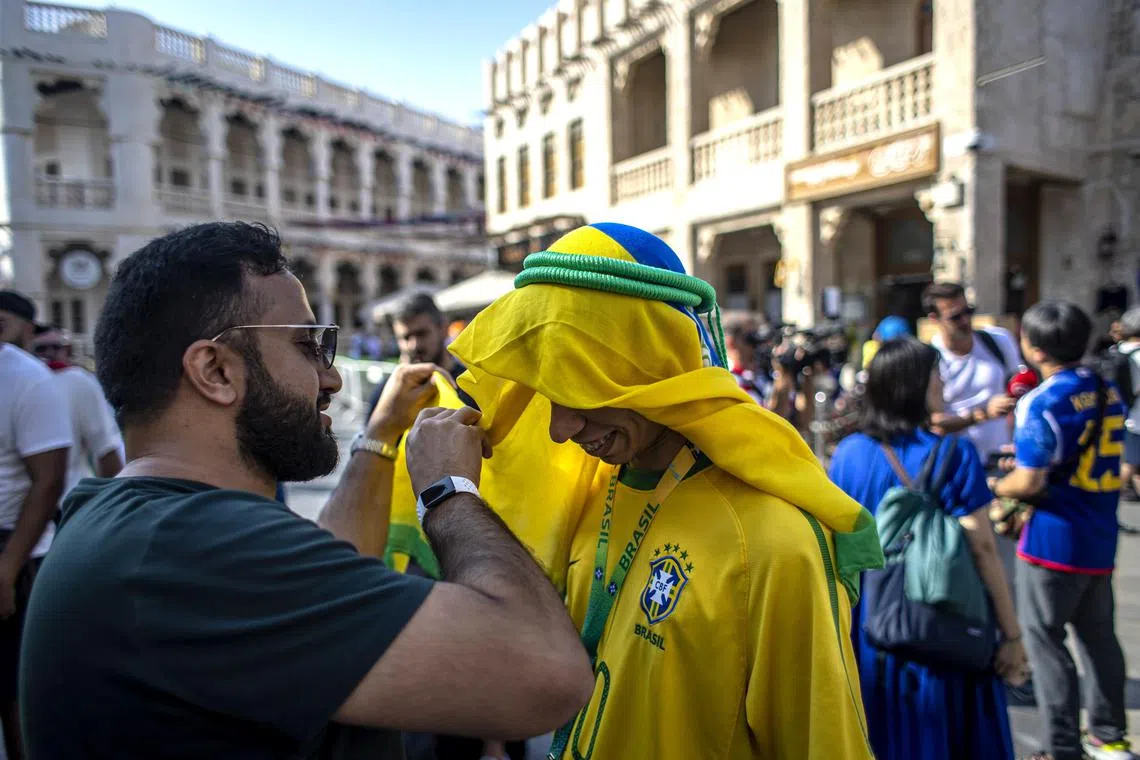 A Brazilian fan getting help in adjusting his flag in the style of a ghutra at the Souq Waqif market.