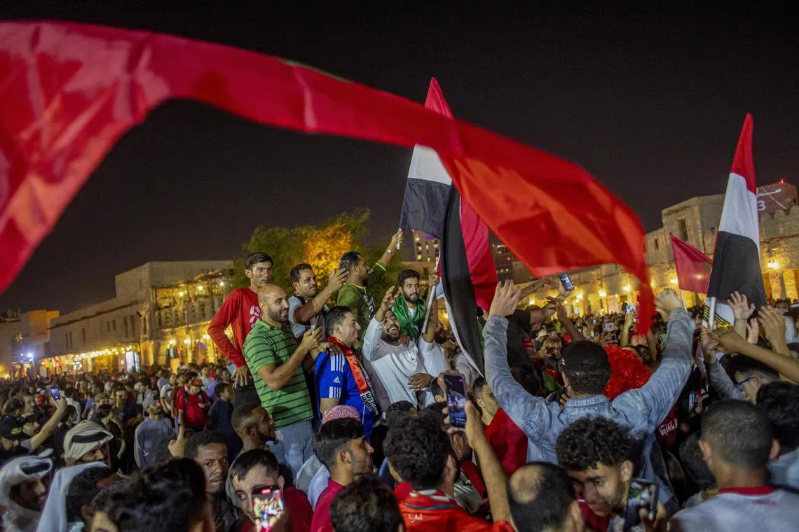 Fans of Morocco celebrate at the Souq Waqif market in Doha after their team stunned Spain to reach the quarter-finals of the World Cup.